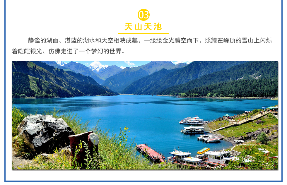 然后返回乌鲁木齐景点推荐天池天山天池古名瑶池,国家AAAAA级旅游区和世界地质公园,是到新疆旅游,一定要前往的景点之一。